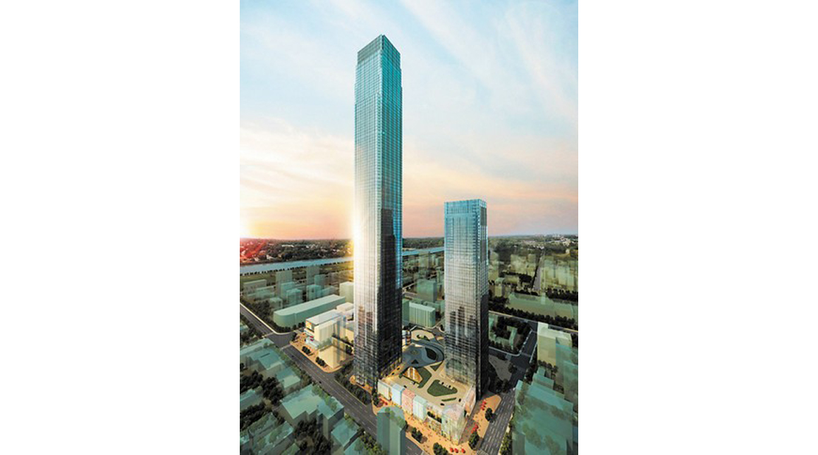 長(zhǎng)沙國(guó)際金融中心主樓高452米,副樓高315米;地下為5層結(jié)構(gòu),負(fù)3層至負(fù)5層為停車場(chǎng),配備2700個(gè)車位;1號(hào)塔樓(主樓)地上93層,2號(hào)塔樓(副樓)地上65層;占地7.44萬平方米,總建筑面積達(dá)102萬平方米。